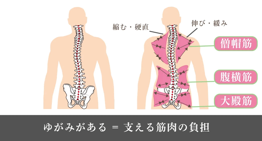 「身体のゆがみ」自体には痛みが伴わないものの、実際には骨や関節を支える筋肉や靭帯に大きな負担をかける原因となります。たとえば、姿勢が悪い場合、骨盤が傾いたり背骨が曲がったりすることがあります。このような状態になると、骨や関節が正常に動かなくなり、周囲の筋肉や靭帯が通常以上に働かなければならなくなります。