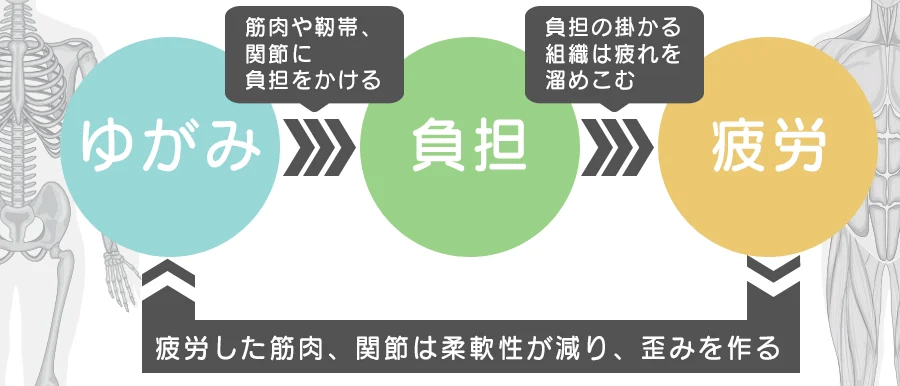 具体的には、ゆがみ→負担→疲労→ゆがみという悪循環が生じやすくなります。このサイクルが続くと、筋肉や組織にかかる負担や疲労が限界を超え、最終的には身体の不調や痛みとして現れるのです。
